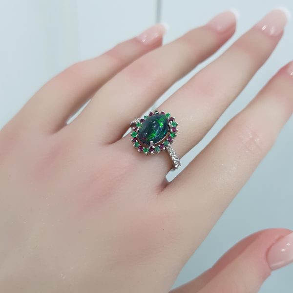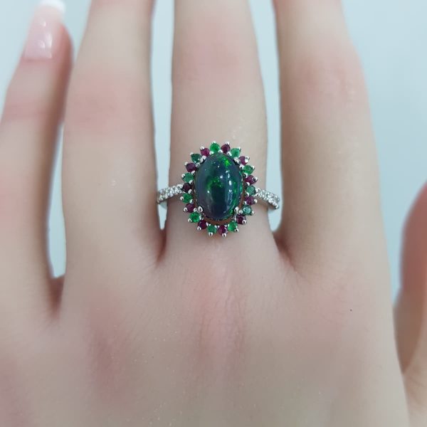 White Gold Diamond Ring with Natural Emerald, Opal and Ruby – R7539