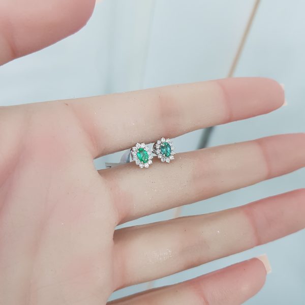 White Gold Diamond Earrings with Natural Emerald – E4986