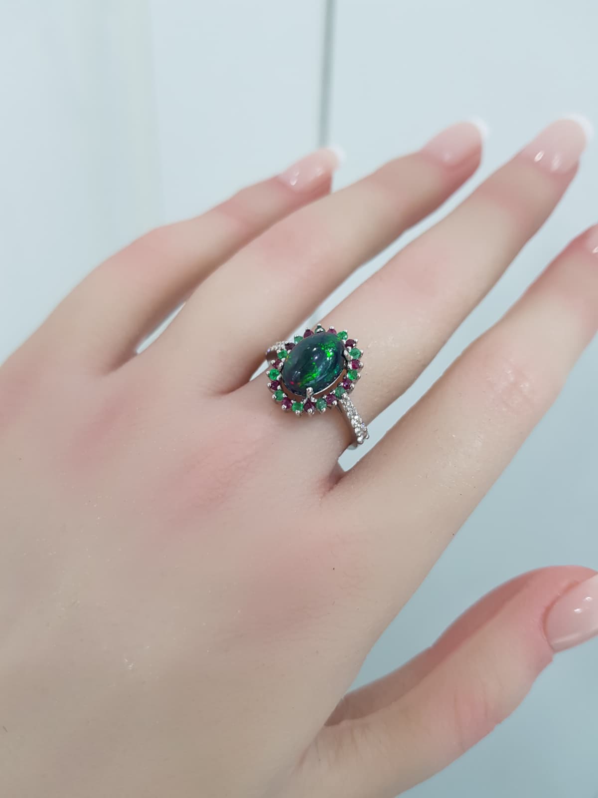 خاتم الماس بلجيكي مع الزمرد الطبيعي، أوبال والياقوتة